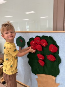 Stories and discussions, singing and dancing are geared to current themes. Children learn to express themselves and formulate ideas with their classmates.