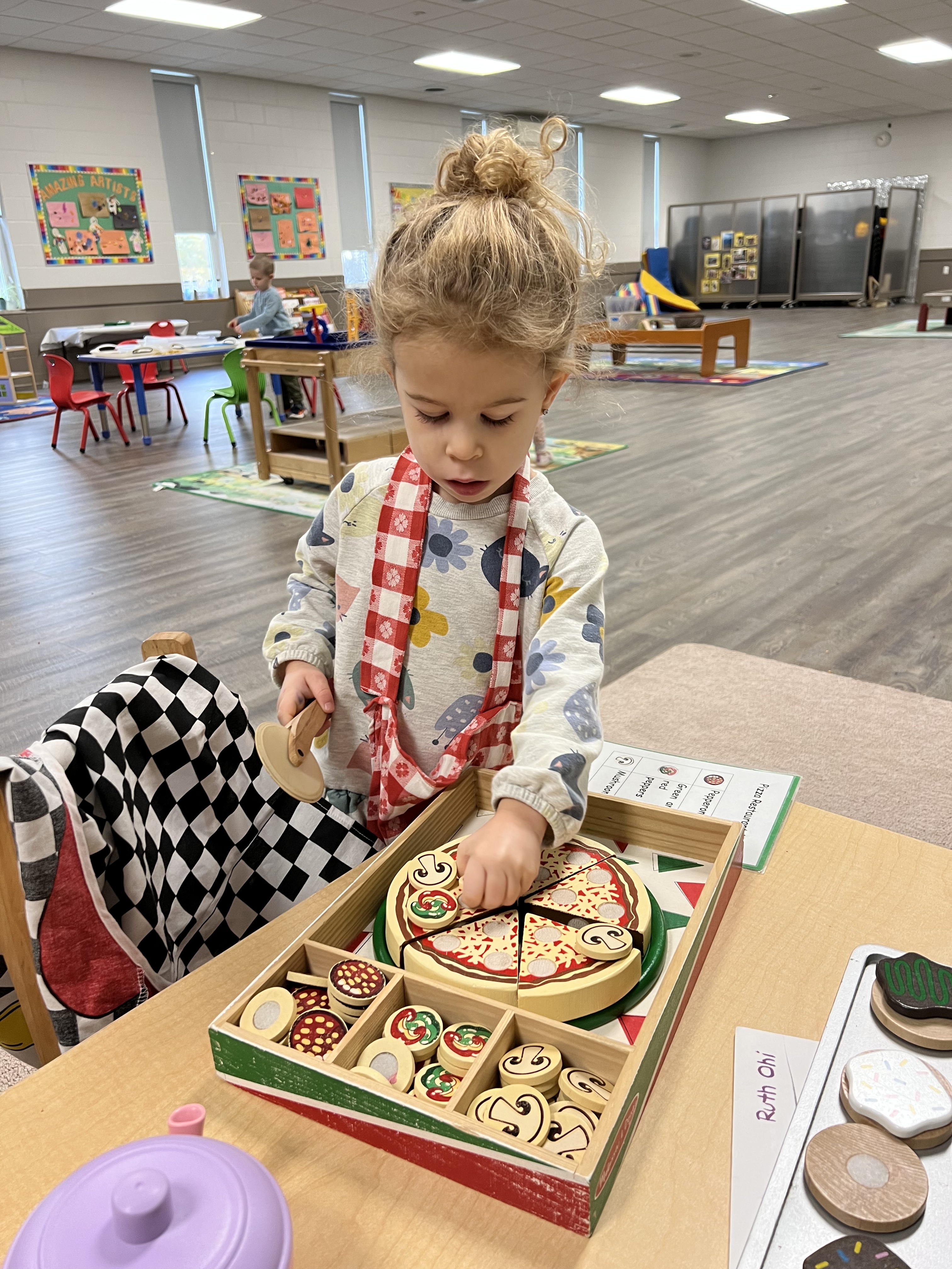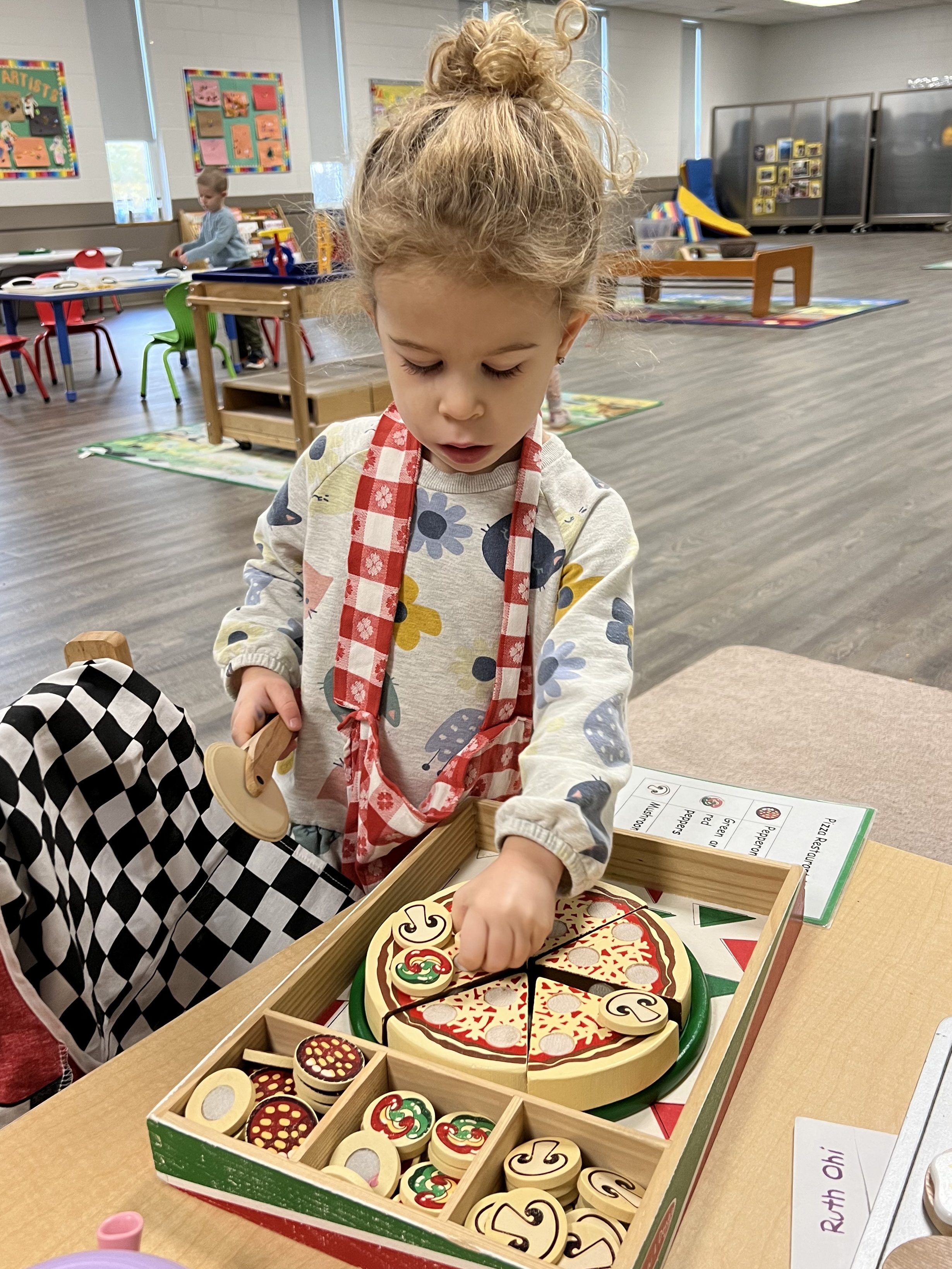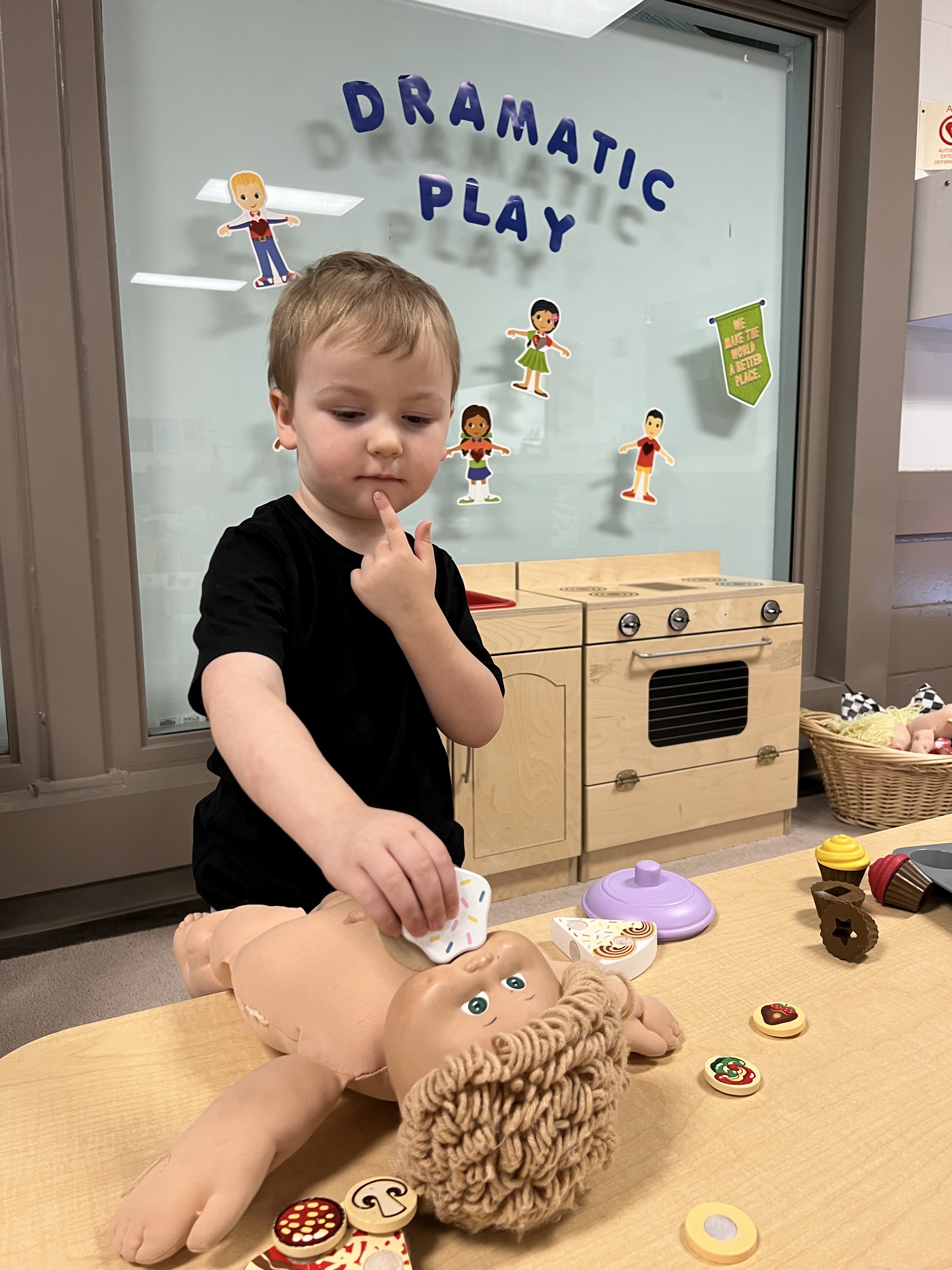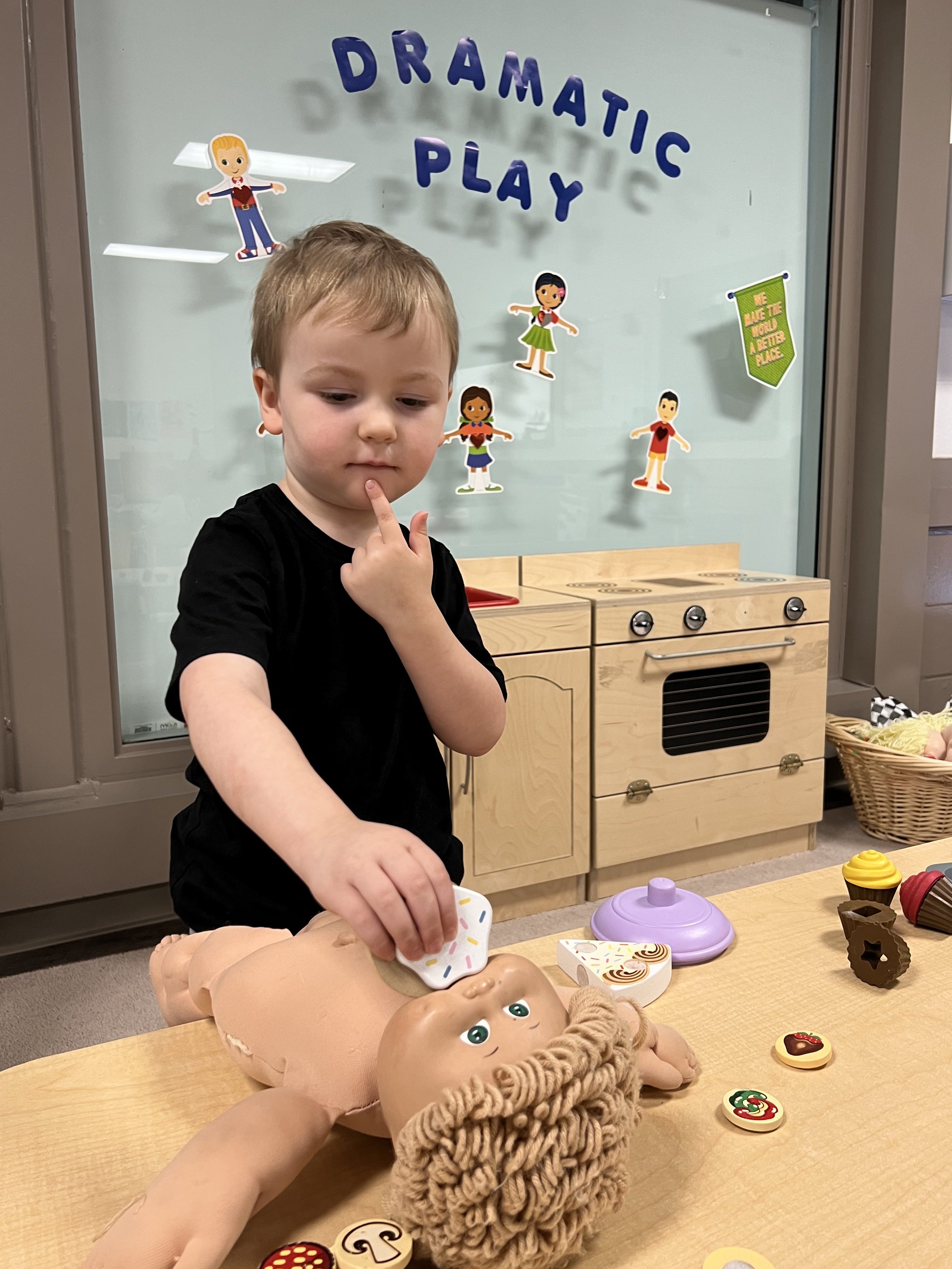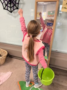 Through role play and dress up in the dramatic play centre, children learn new ways to express themselves. In addition to supporting creativity – imaginative exploration helps to promote problem-solving skills, self-expression and social skills.